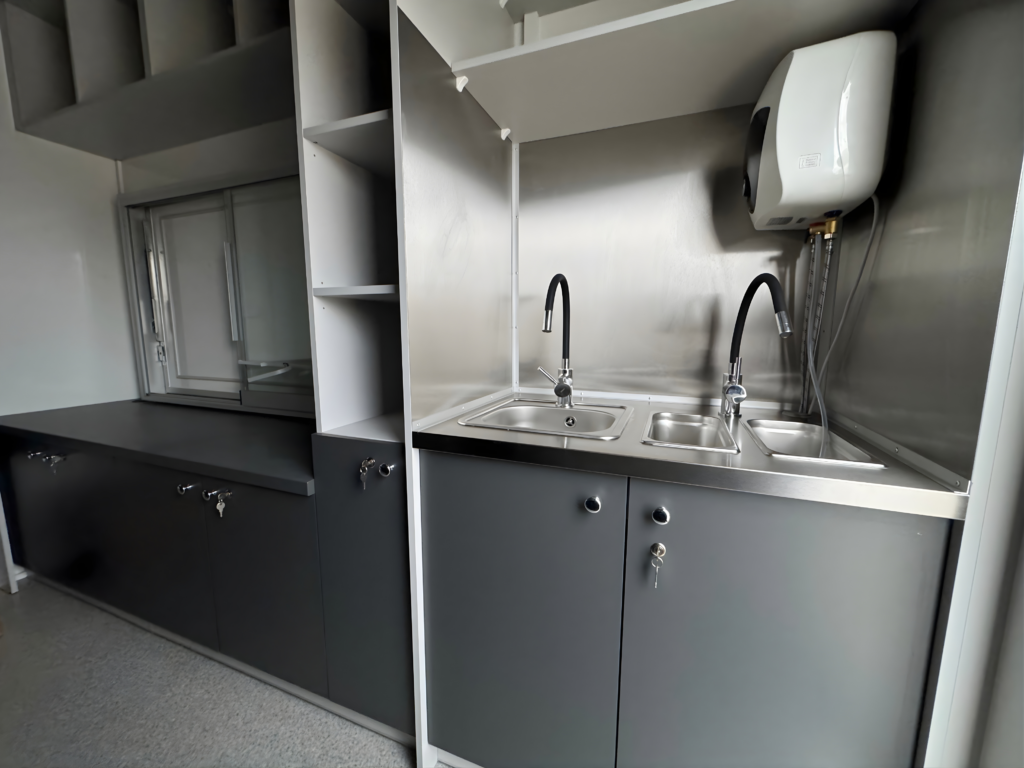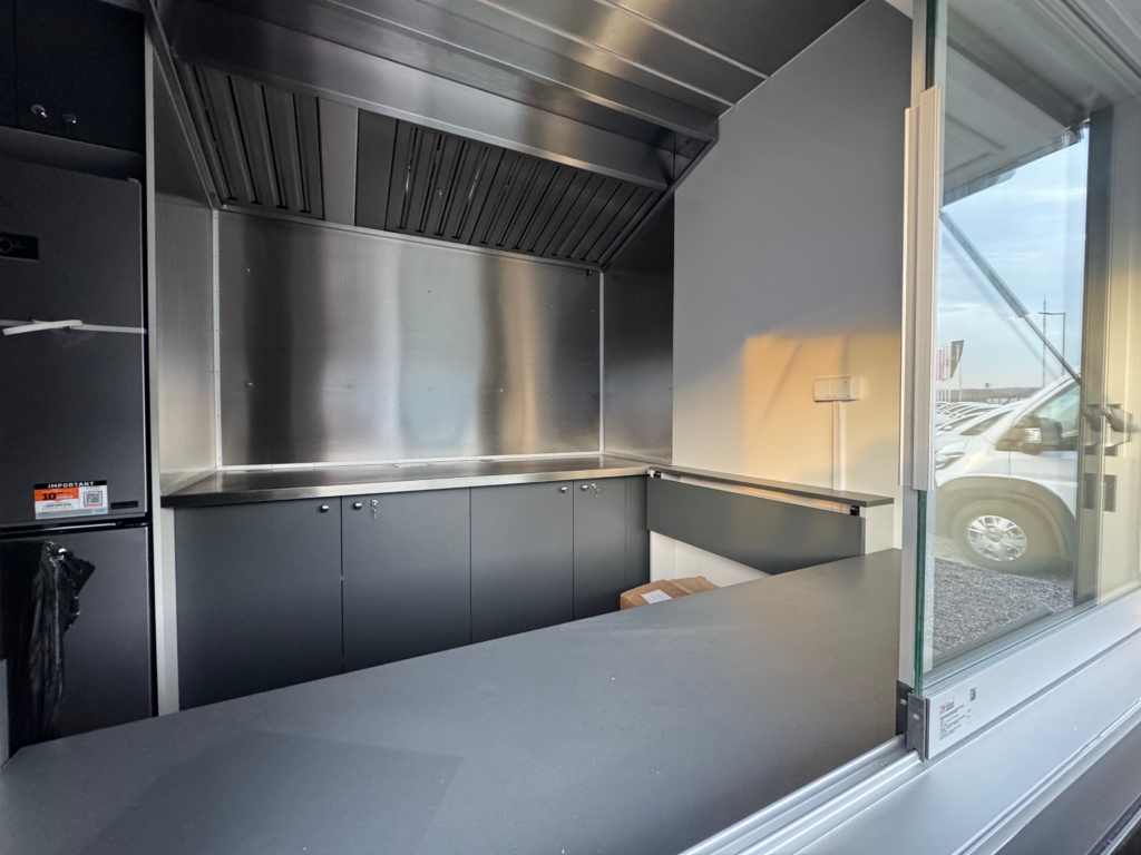 Der Innenraum des Anhängers wurde ergonomisch gestaltet und ist auf intensive Arbeit auf kleiner Fläche ausgelegt. Die Ausstattung umfasst robuste, leicht zu reinigende Materialien, Edelstahl-Arbeitsflächen, geräumige Schränke, Ablageflächen sowie Platz für professionelle Gastronomiegeräte. Über dem Zubereitungsbereich wurde eine leistungsstarke Dunstabzugshaube installiert, die für hohen Arbeitskomfort sorgt und alle hygienischen Anforderungen erfüllt.