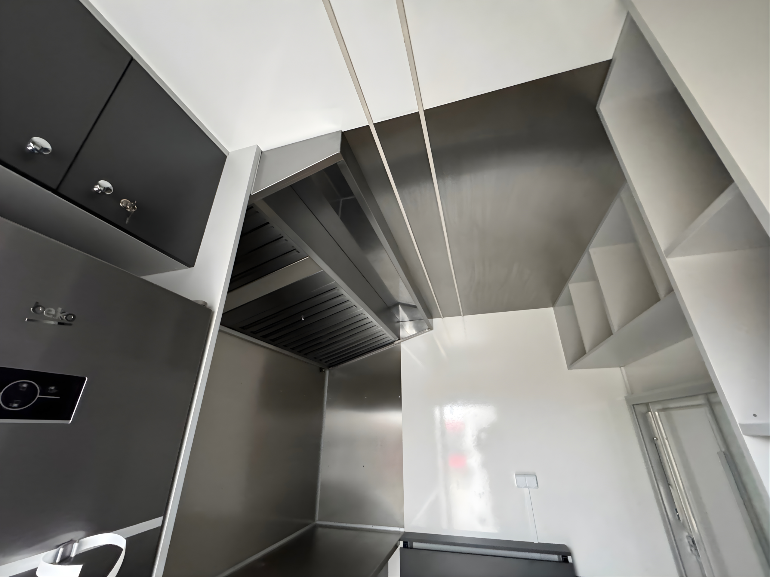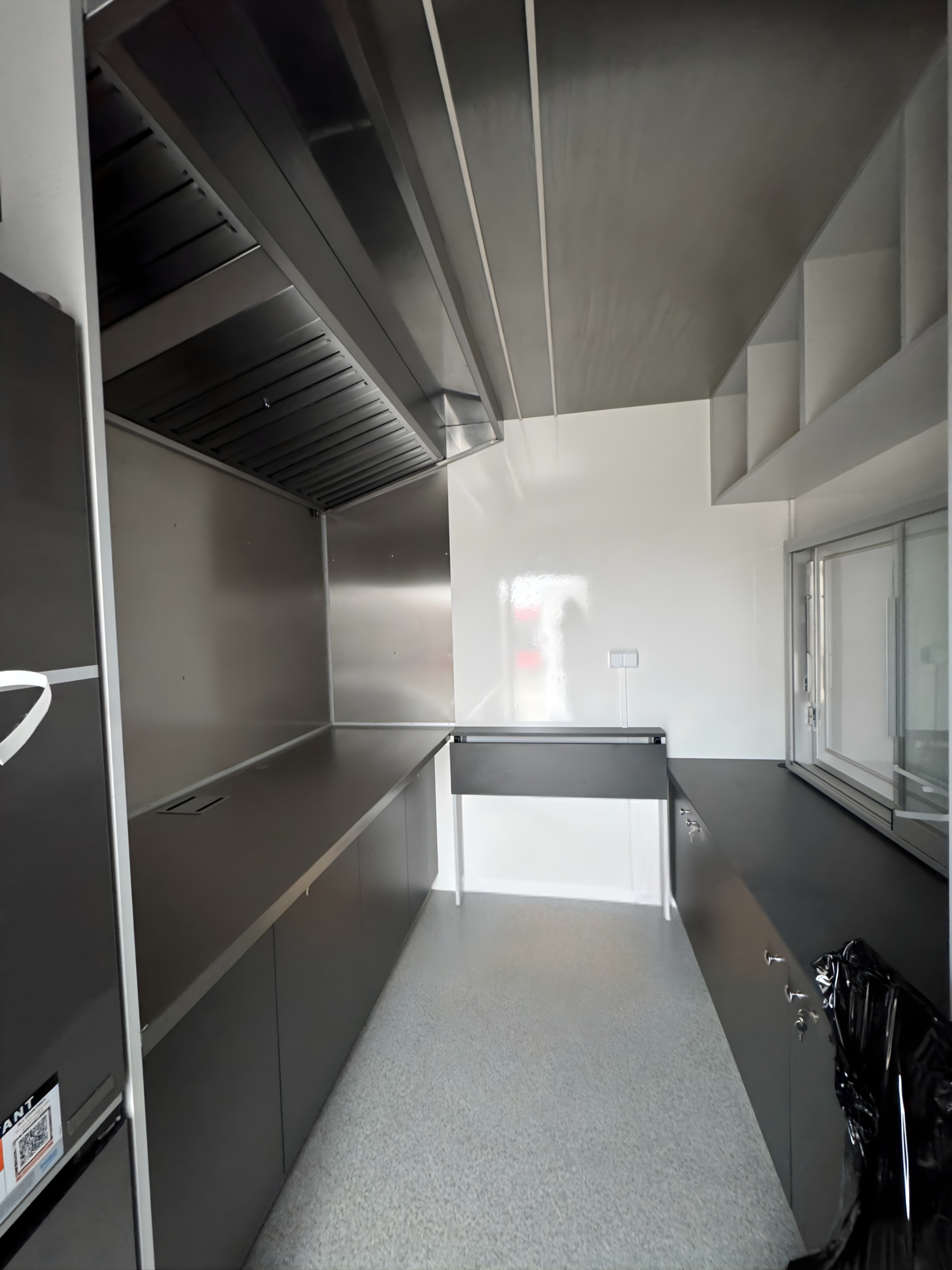 Der Innenraum des Anhängers wurde ergonomisch gestaltet und ist auf intensive Arbeit auf kleiner Fläche ausgelegt. Die Ausstattung umfasst robuste, leicht zu reinigende Materialien, Edelstahl-Arbeitsflächen, geräumige Schränke, Ablageflächen sowie Platz für professionelle Gastronomiegeräte. Über dem Zubereitungsbereich wurde eine leistungsstarke Dunstabzugshaube installiert, die für hohen Arbeitskomfort sorgt und alle hygienischen Anforderungen erfüllt.