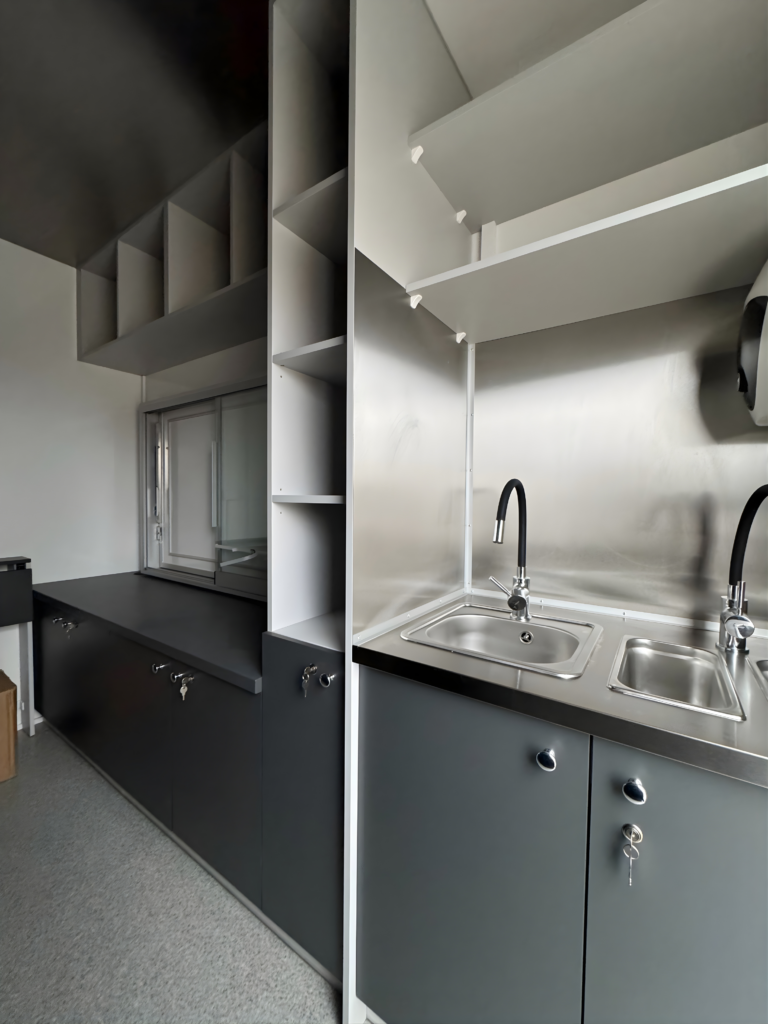 The interior of the trailer was designed ergonomically, allowing for intensive work in a compact space. The build features durable, easy-to-clean materials, including stainless steel worktops, spacious cabinets, storage shelves, and dedicated space for professional catering equipment. Above the food preparation area, a high-performance ventilation hood was installed to ensure working comfort and compliance with sanitary requirements.