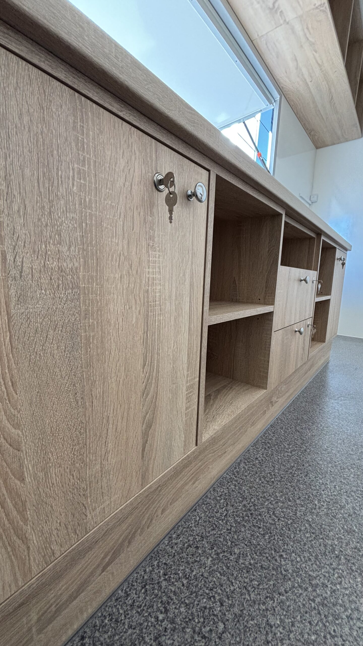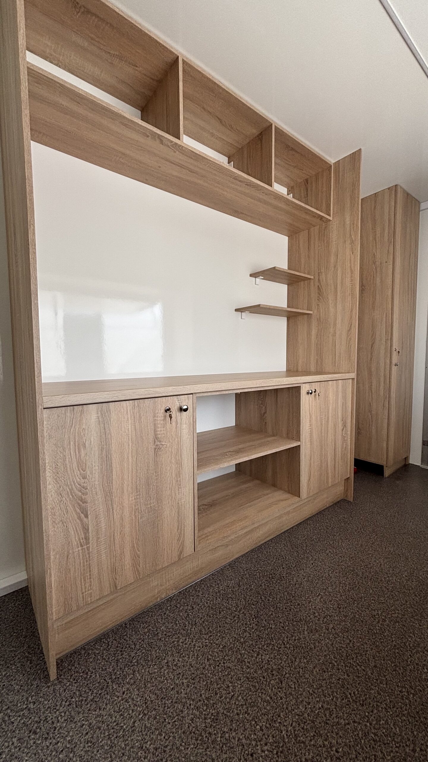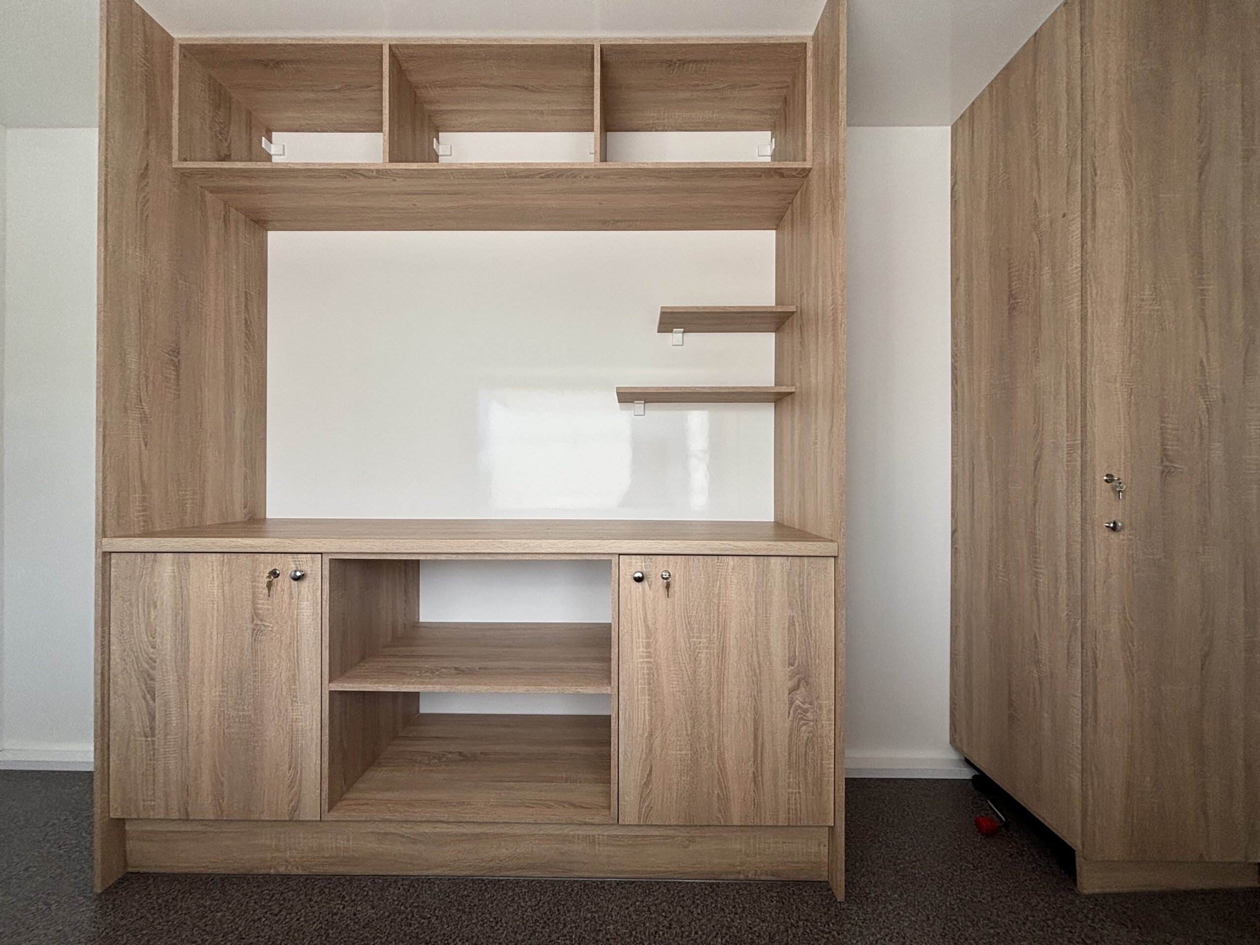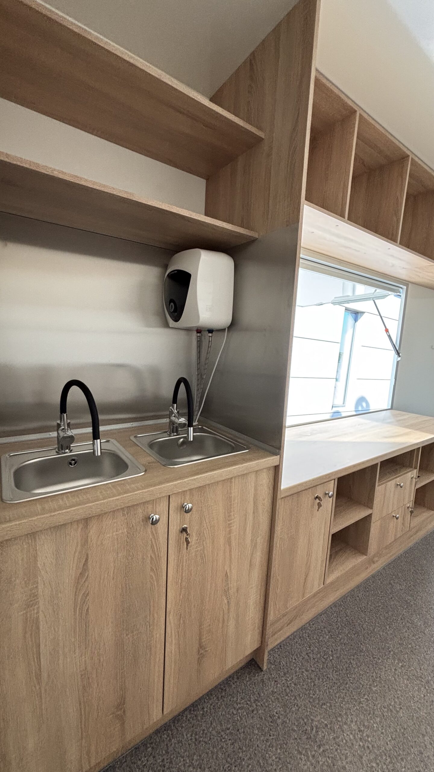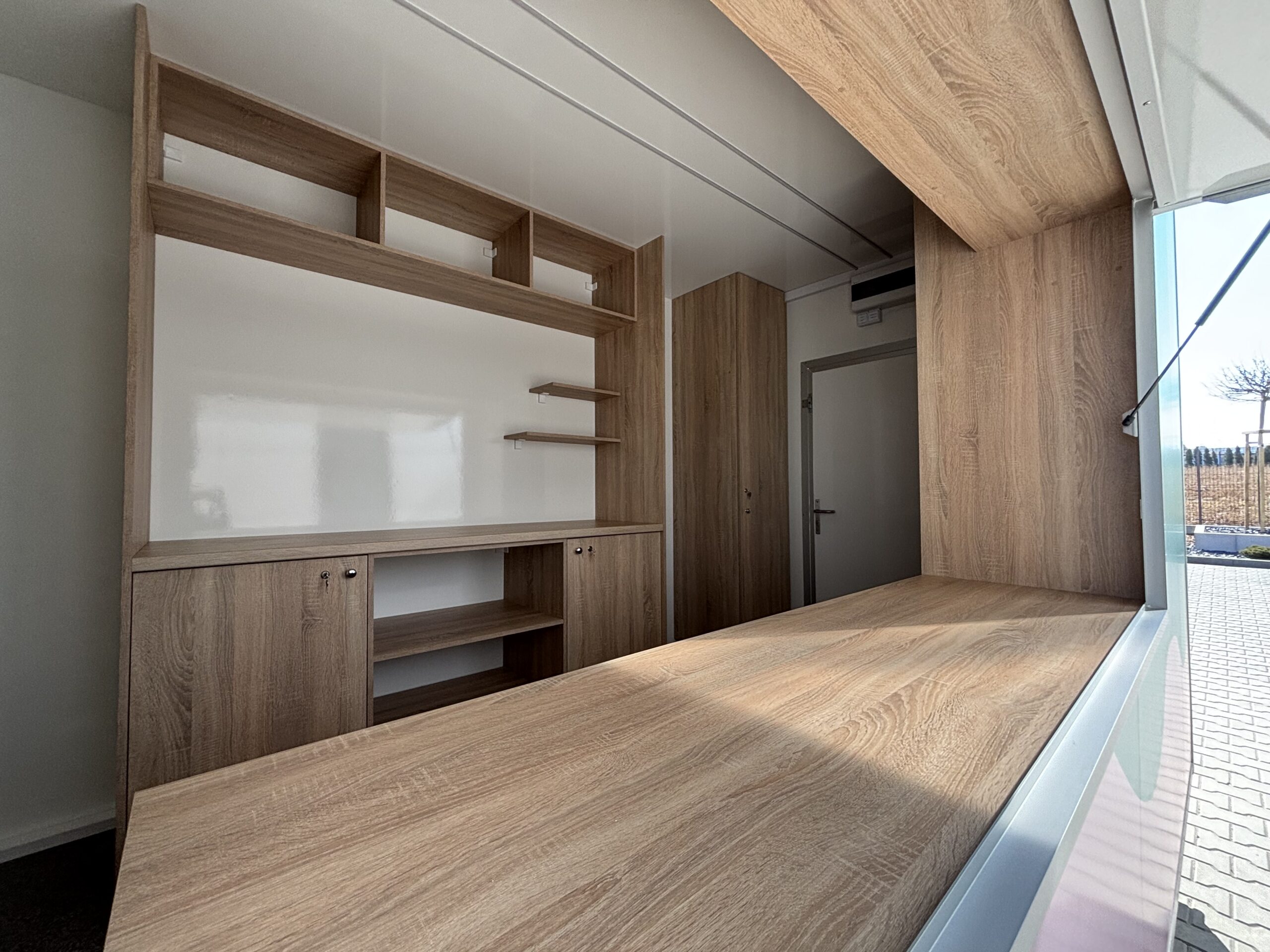Zabudowa meblowa z dostosowaniem do konceptu słodkiego, zgodna z wymogami Sanepidu. Meble wykonane z płyt wiórowych laminowanych o podwyższonej gęstości. Blat roboczy zabezpieczony blachą kwasową.
