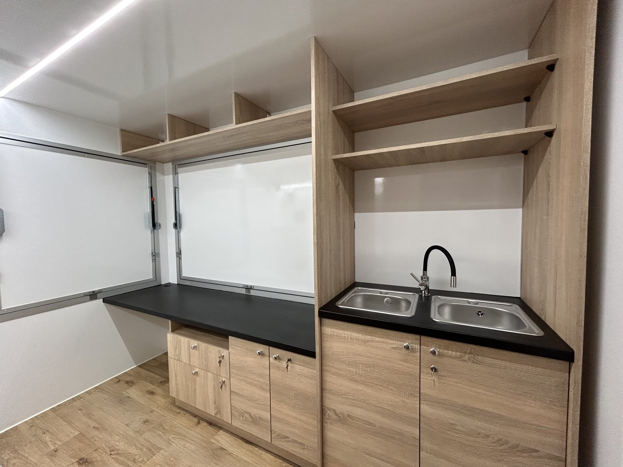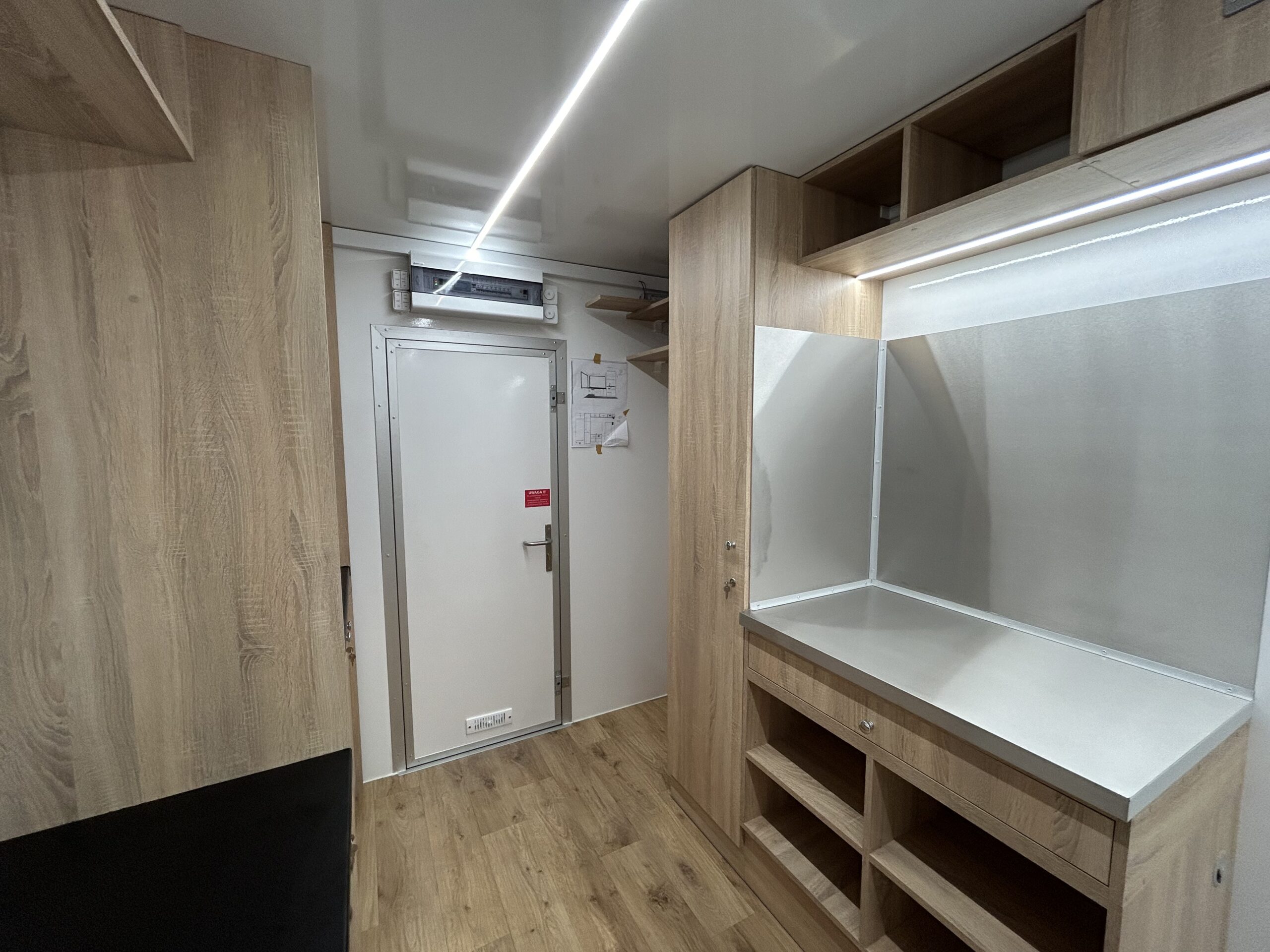 Zabudowa meblowa z dostosowaniem do konceptu słodkiego, zgodna z wymogami Sanepidu. Meble wykonane z płyt wiórowych laminowanych o podwyższonej gęstości. Blat roboczy zabezpieczony blachą kwasową.