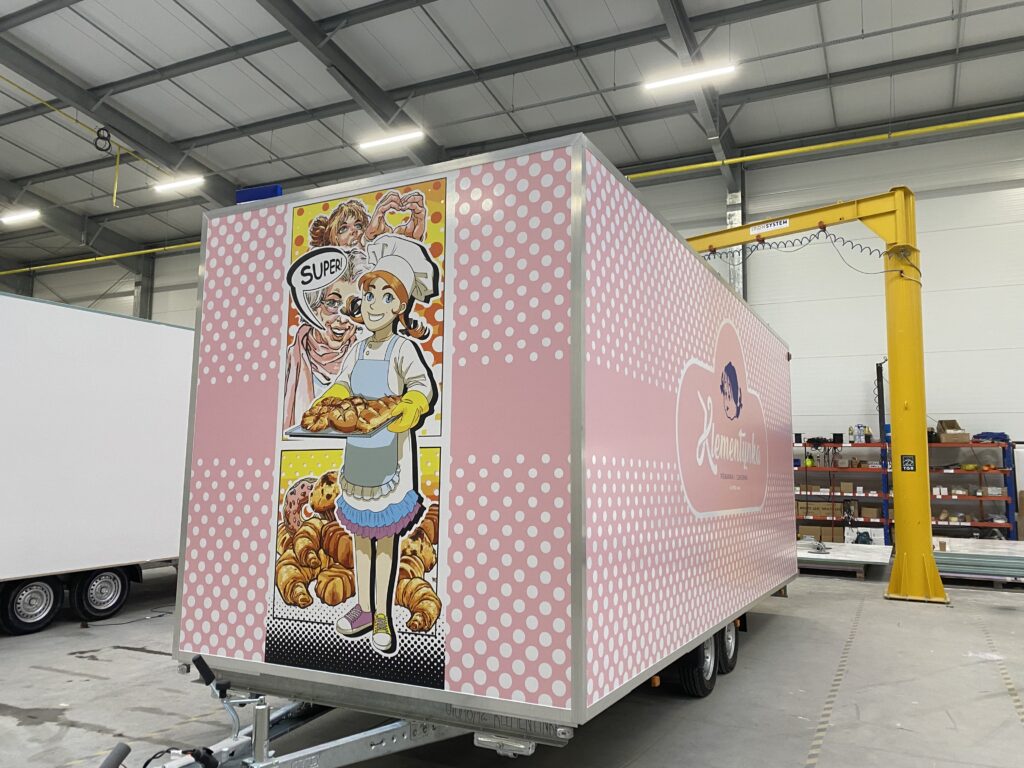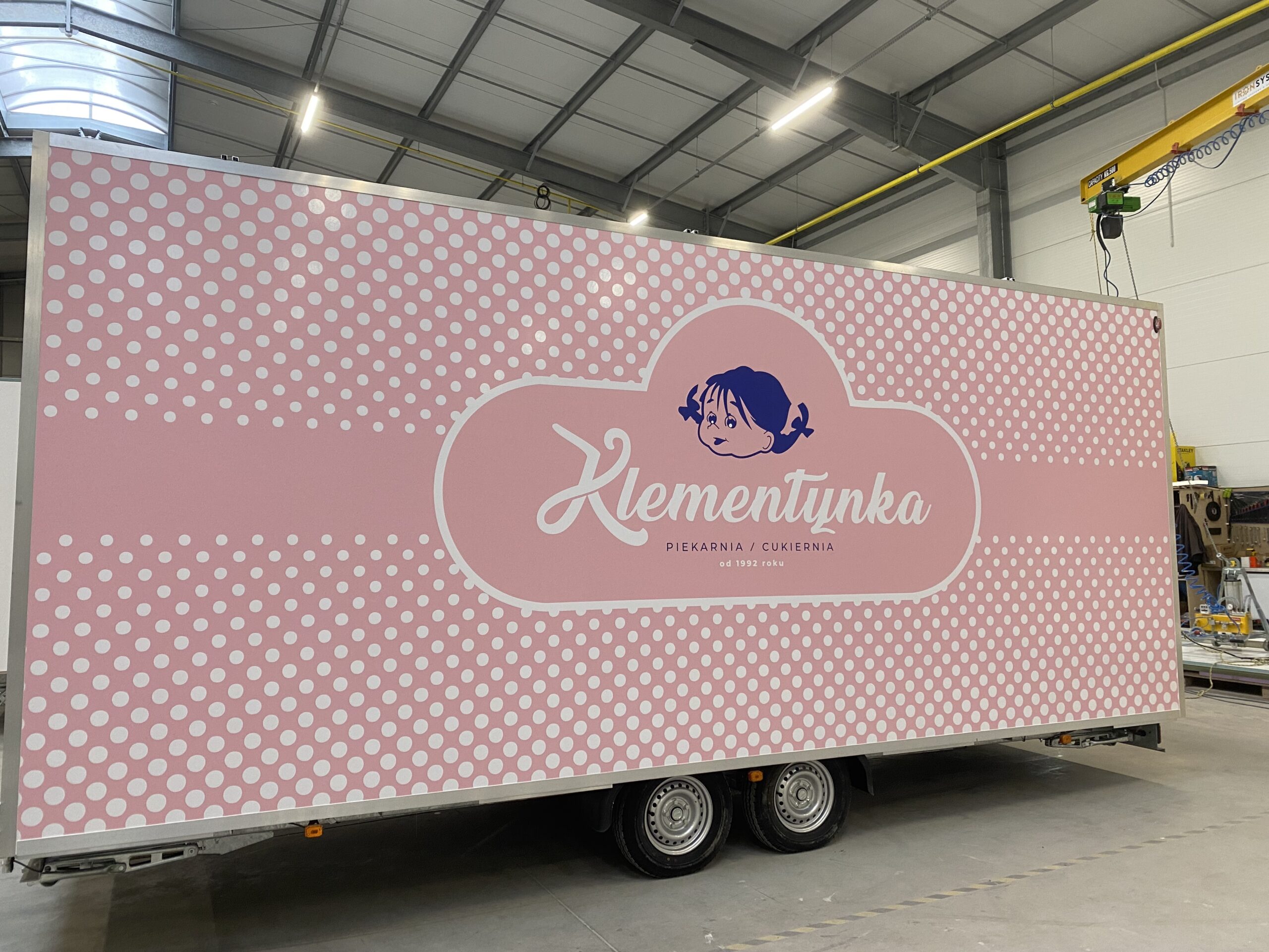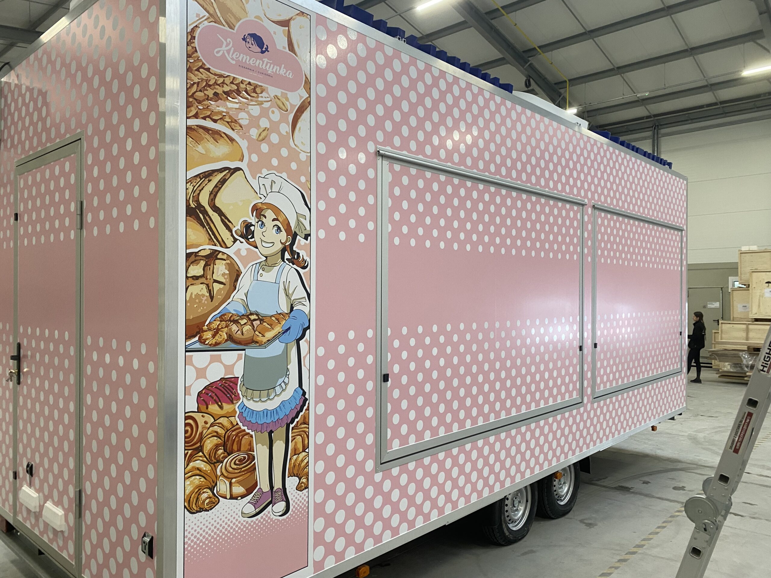 Całość realizacji została wykonana z dbałością o każdy detal – od projektu graficznego, przez ergonomię wnętrza, aż po solidną konstrukcję przystosowaną do codziennej, intensywnej eksploatacji. KLEMENTYNKA to przykład przyczepy gastronomicznej, która nie tylko spełnia wszystkie wymagania funkcjonalne mobilnej piekarni, ale również skutecznie buduje wizerunek marki i przyciąga klientów już z daleka. To mobilny punkt sprzedaży, który realnie wspiera rozwój biznesu i pozwala wyróżnić się na konkurencyjnym rynku.