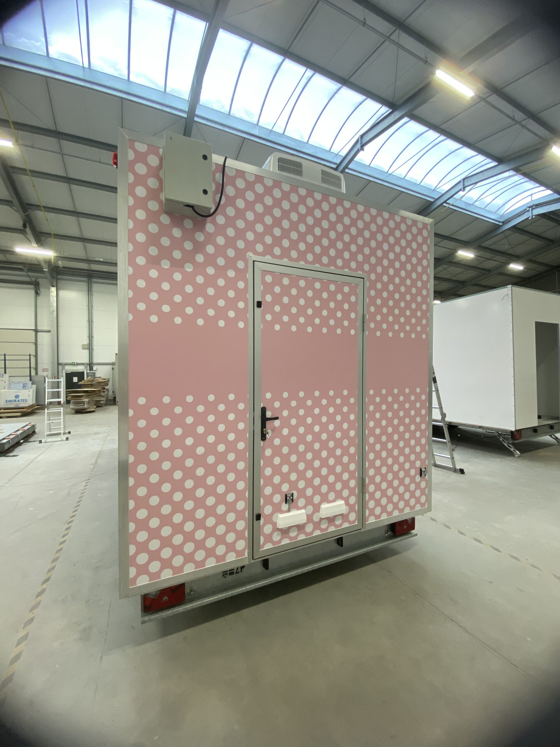 Elewacja przyczepy wyróżnia się pastelową, różową kolorystyką z motywem kropek, która budzi pozytywne emocje i natychmiast kojarzy się z rzemieślniczym wypiekiem oraz domową jakością. Centralnym elementem jest efektowna grafika w stylu ilustracyjnym oraz wyraźnie wyeksponowane logo, co zapewnia doskonałą rozpoznawalność marki. Duża klapa sprzedażowa umożliwia wygodną obsługę klientów i atrakcyjną ekspozycję produktów.