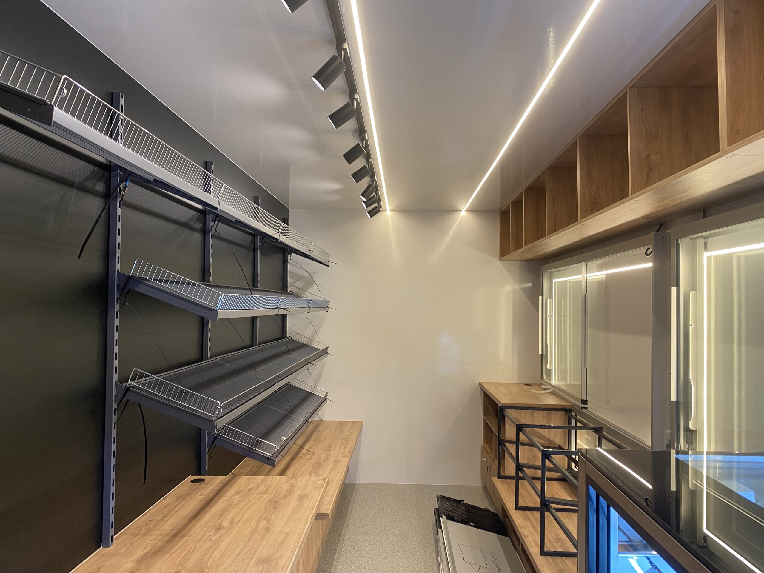 Zastosowane oświetlenie LED – zarówno liniowe, jak i punktowe – nadaje wnętrzu nowoczesny charakter i skutecznie podkreśla ekspozycję produktów. Starannie dobrane detale, metalowe elementy konstrukcyjne oraz wysoka jakość wykończenia sprawiają, że przyczepa prezentuje się profesjonalnie i spójnie z identyfikacją wizualną marki.