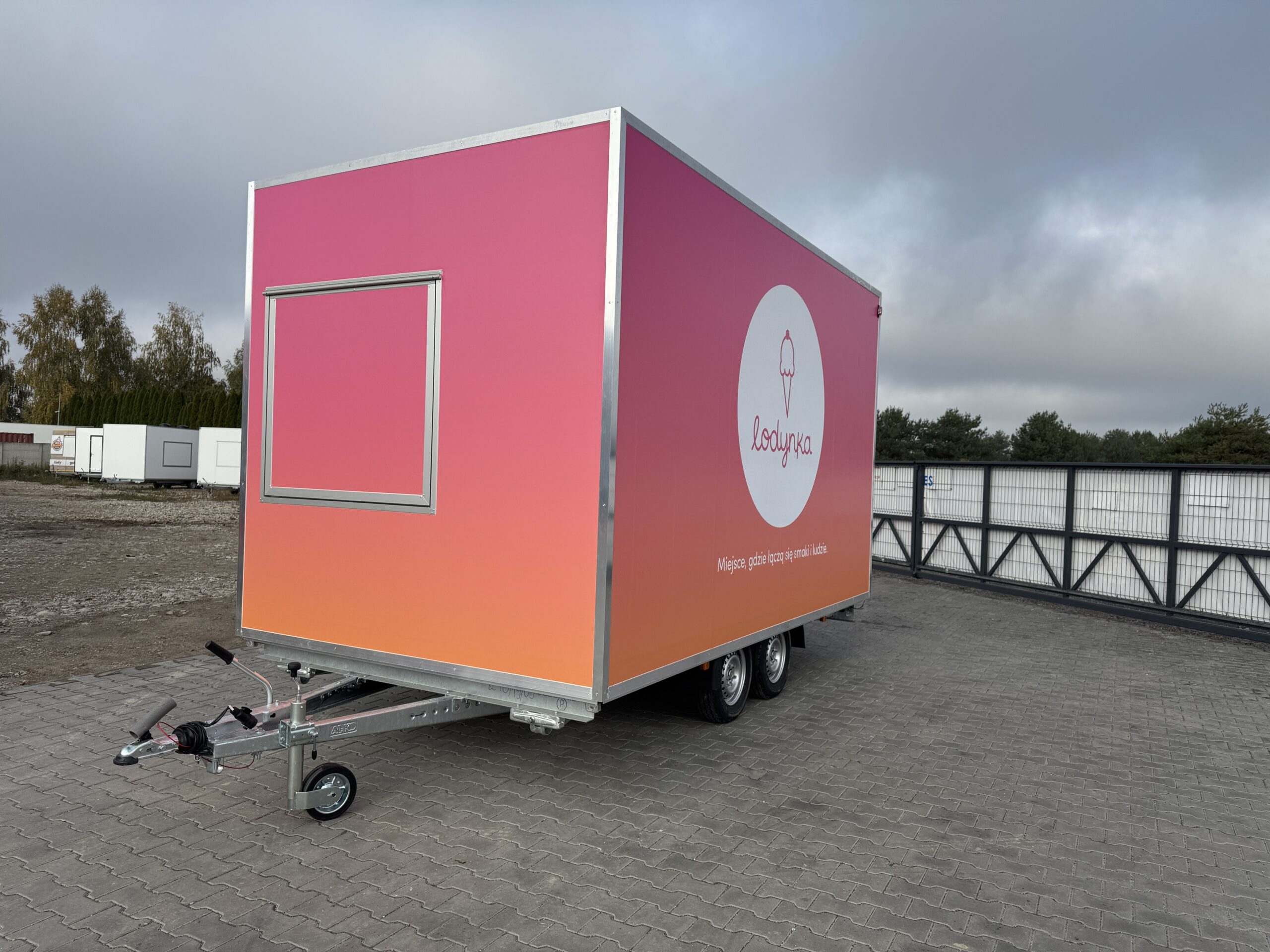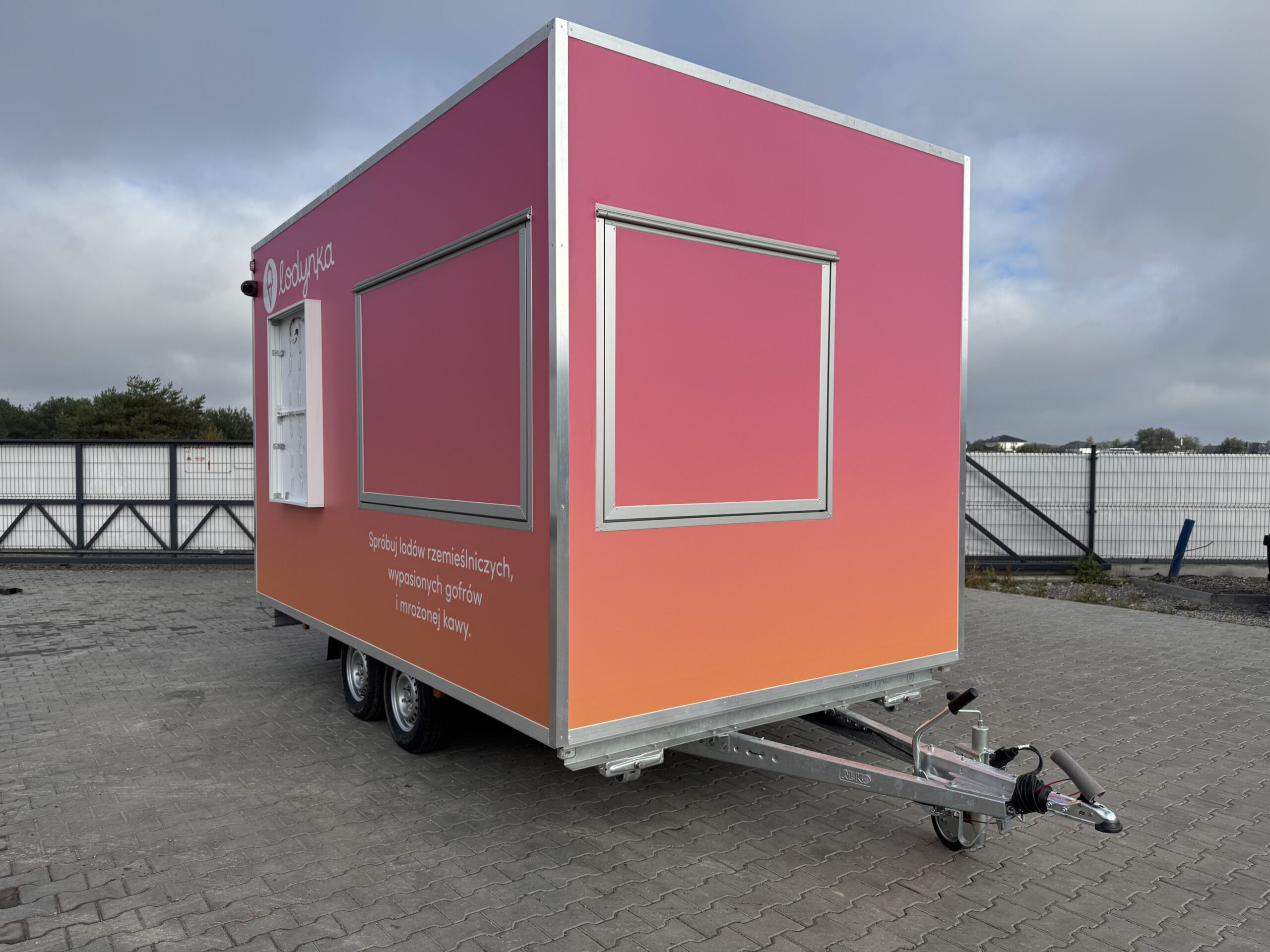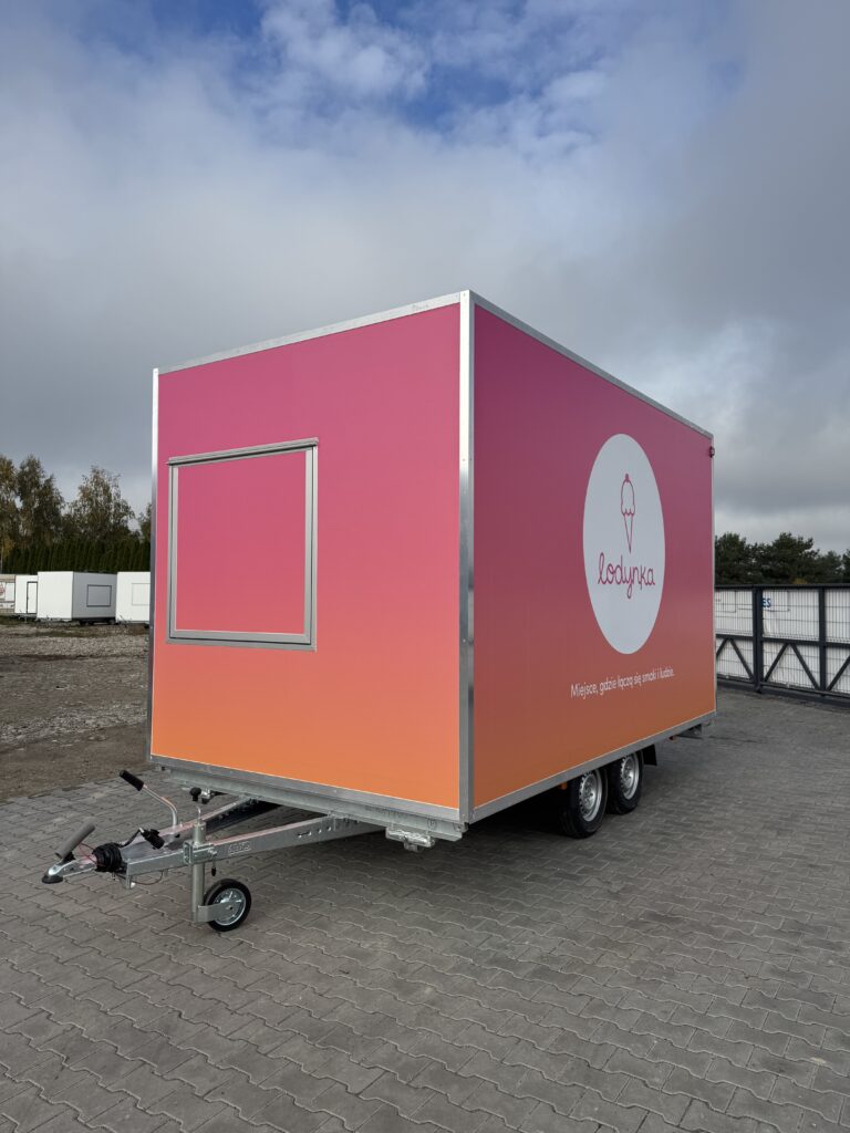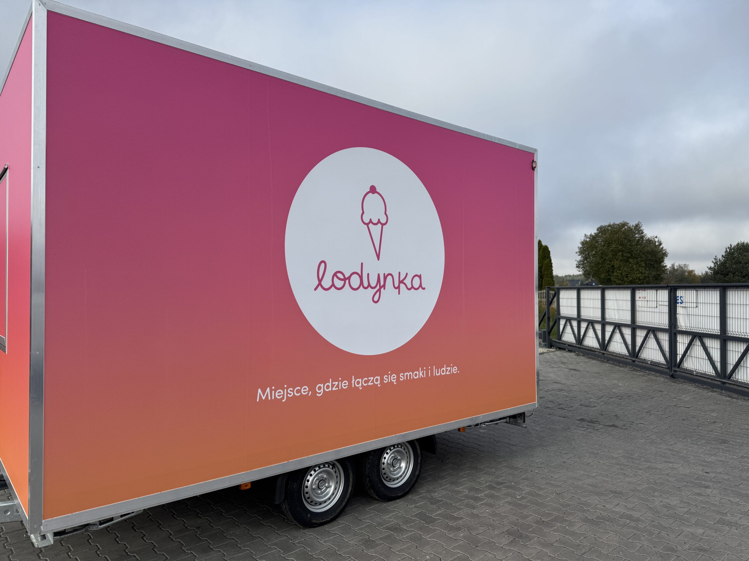 Gradientowa okleina w połączeniu z minimalistycznym logotypem nadaje przyczepie wyróżniający styl premium, dzięki któremu marka jest natychmiast rozpoznawalna w przestrzeni publicznej. Jednocześnie konstrukcja została przygotowana tak, aby praca w środku była wygodna i ergonomiczna nawet podczas intensywnej sprzedaży w sezonie.