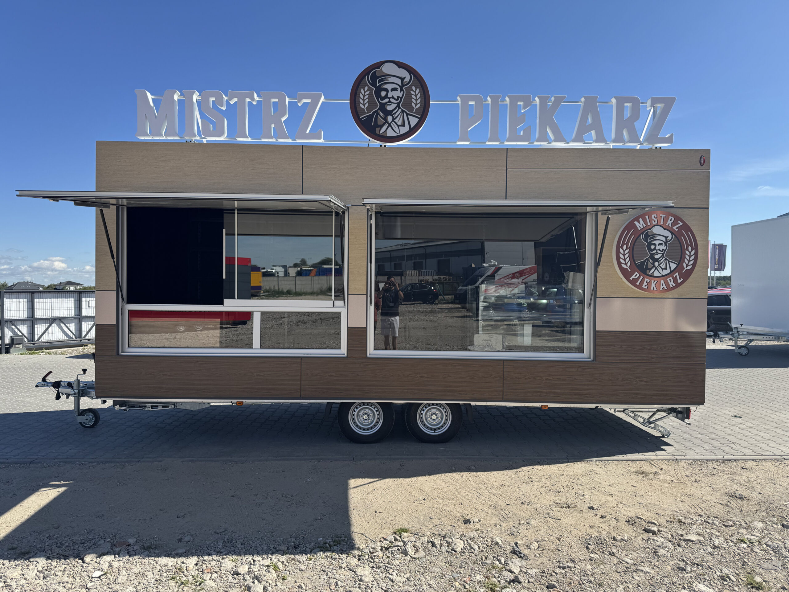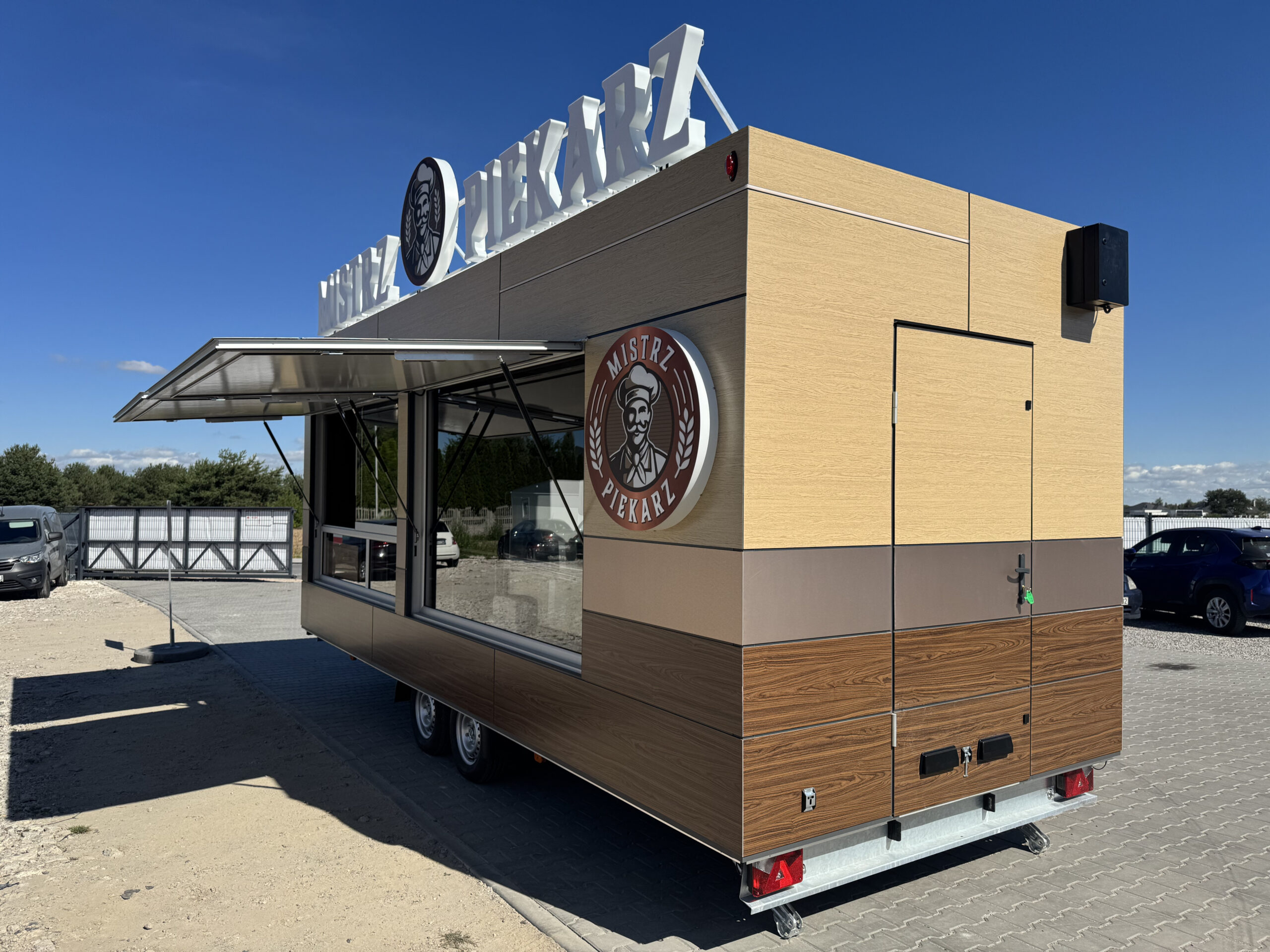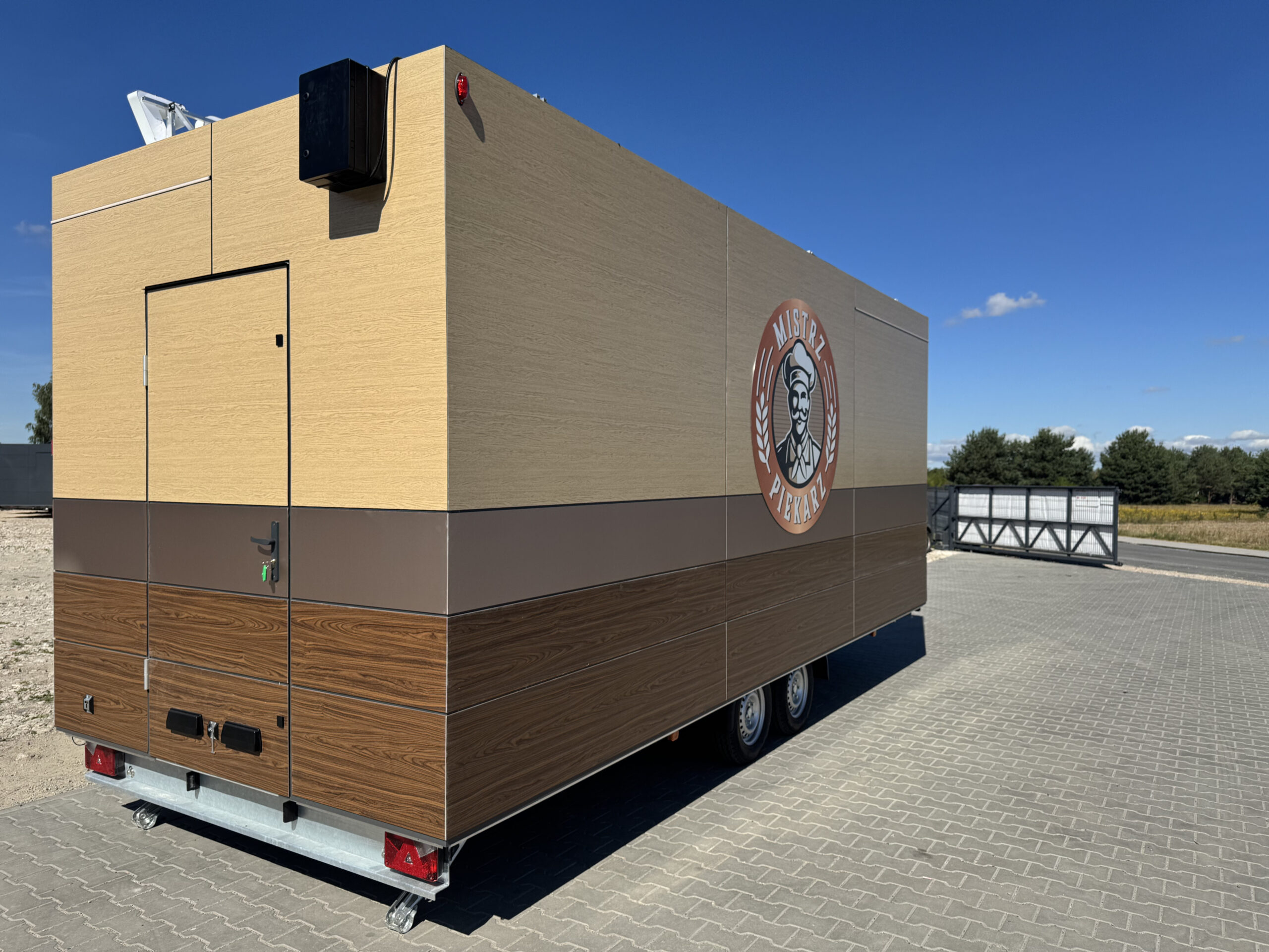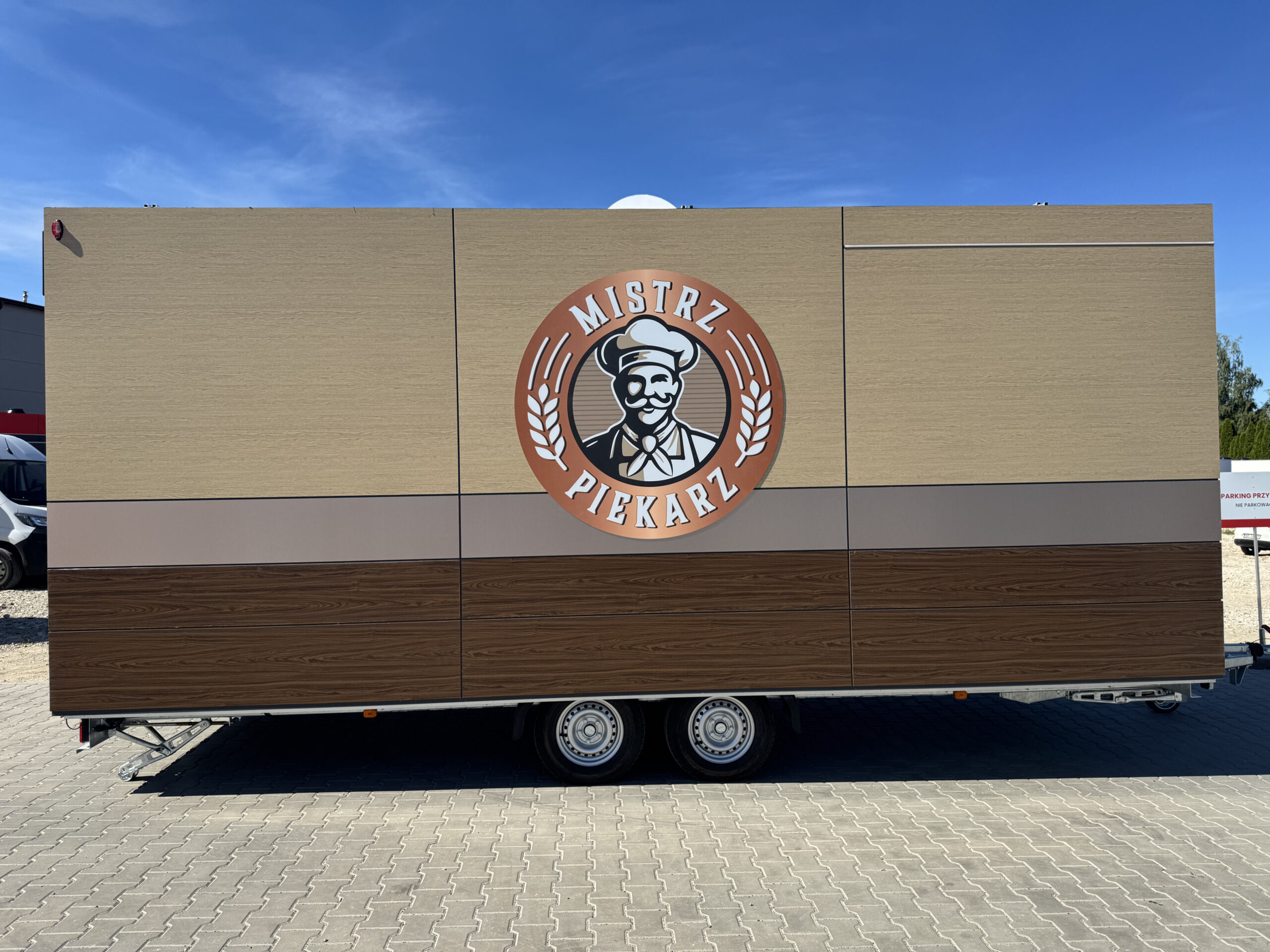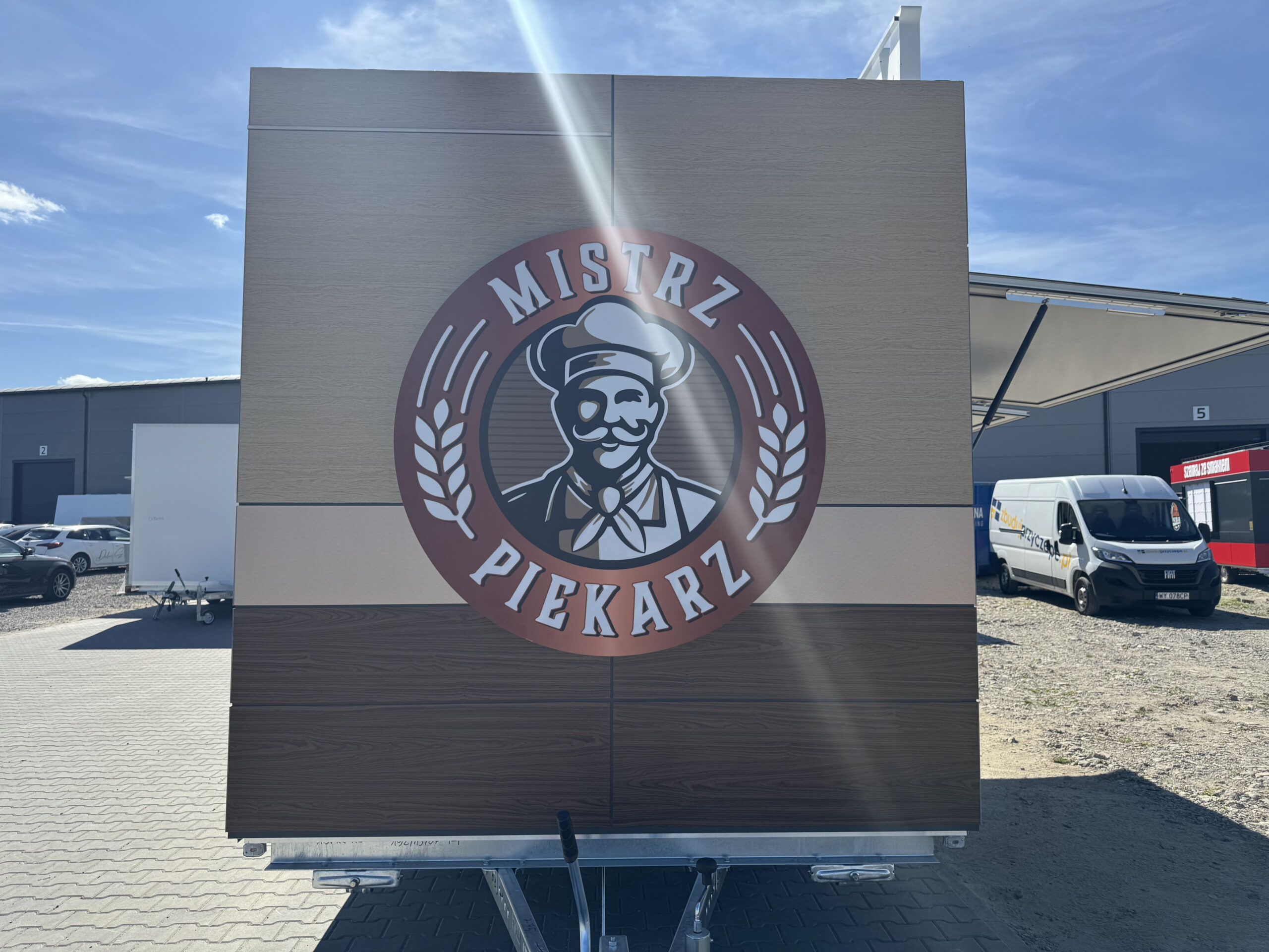 Z zewnątrz przyczepa wyróżnia się charakterystyczną identyfikacją wizualną marki Mistrz Piekarz, dużym logo oraz efektownym szyldem umieszczonym na dachu.