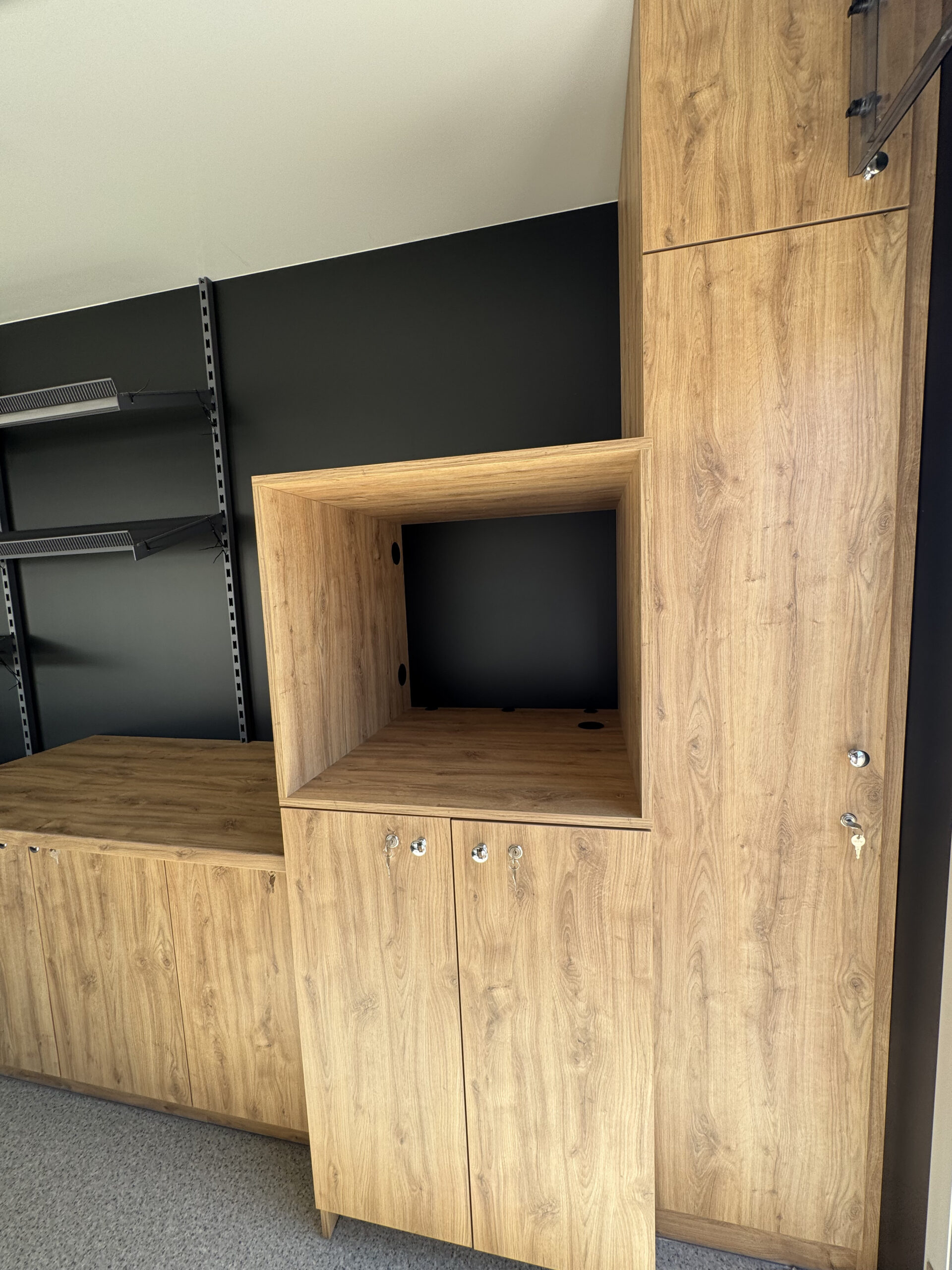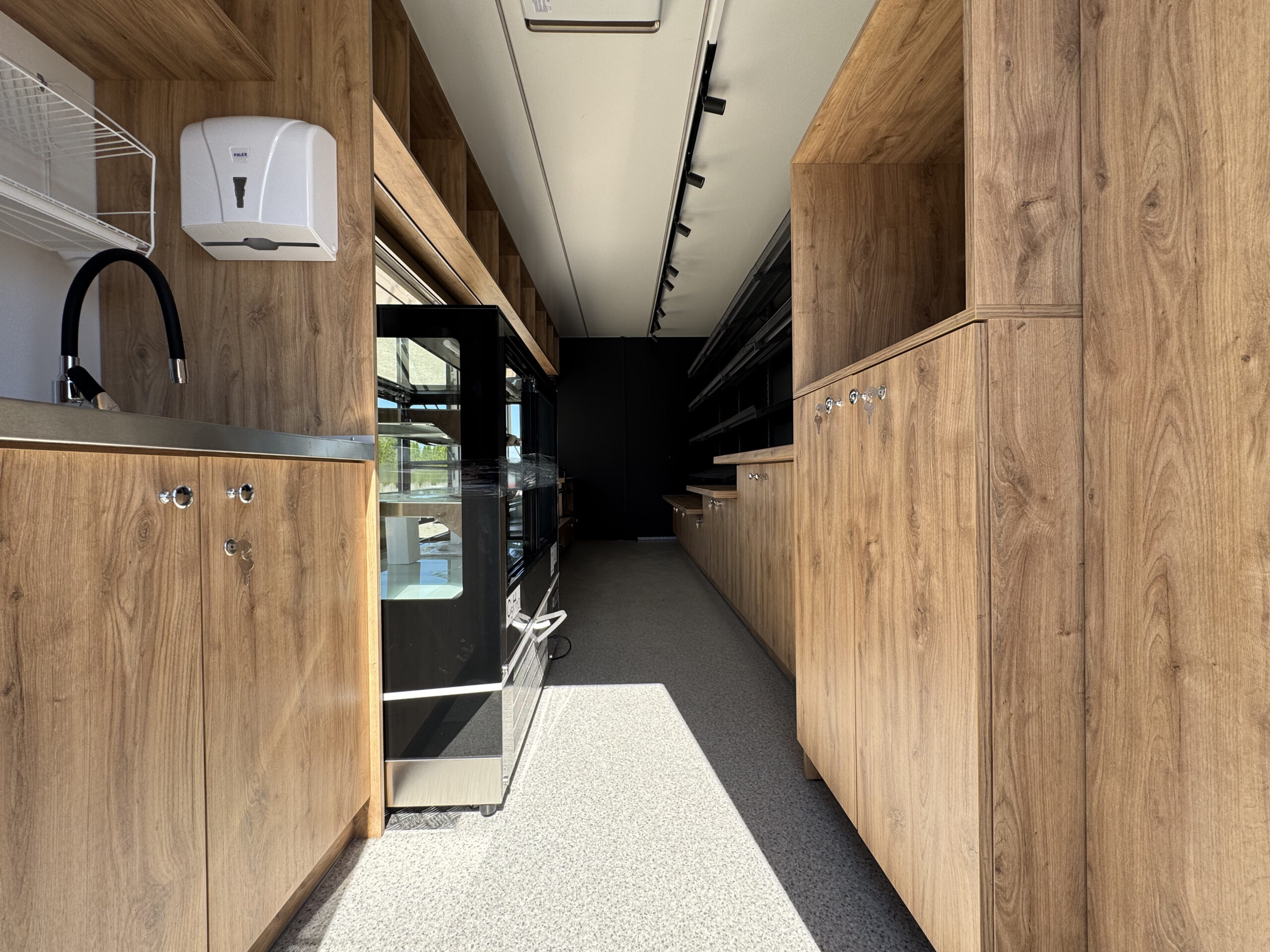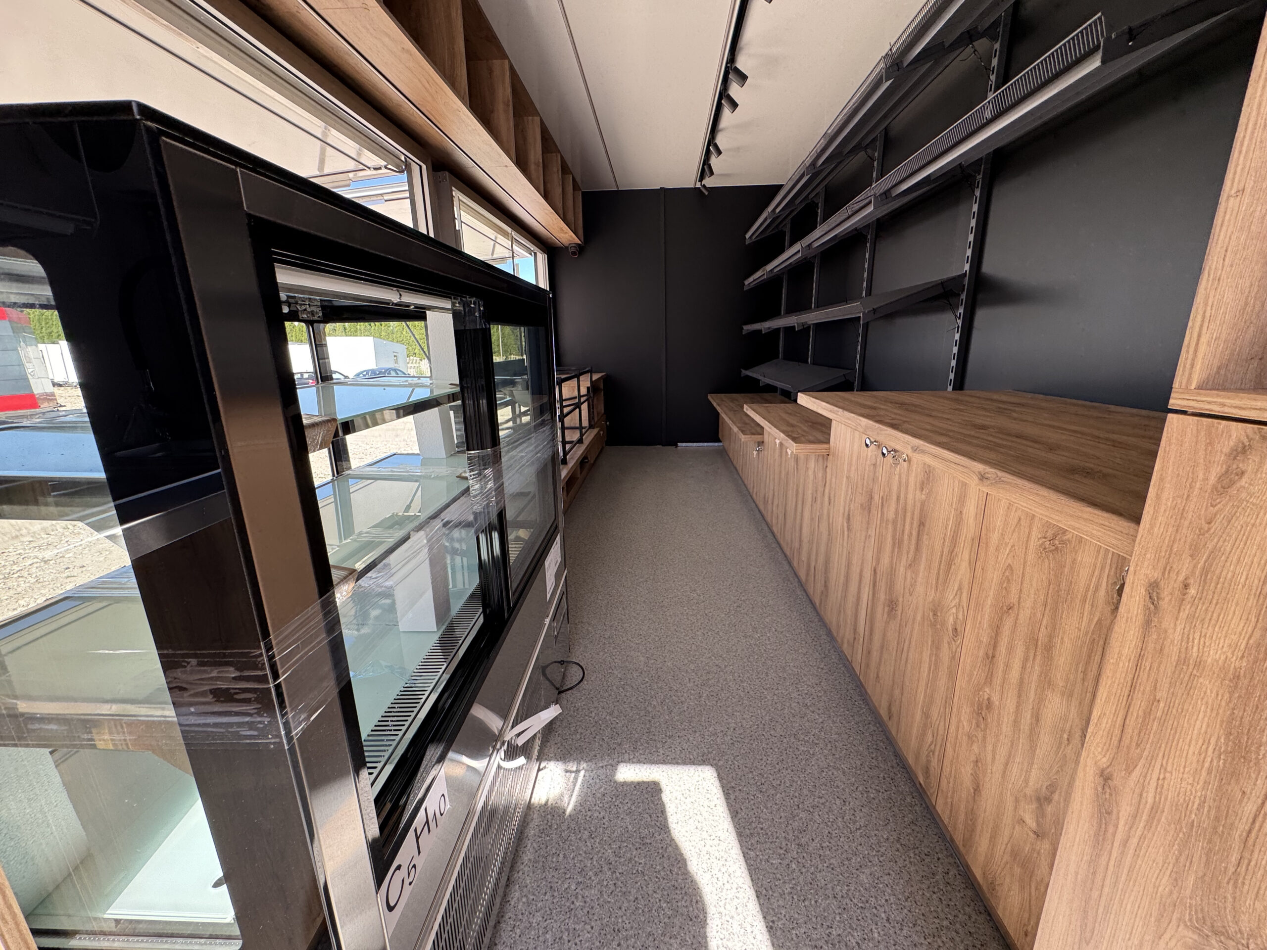 Wnętrze przyczepy utrzymane jest w ciepłej, drewnianej tonacji i wyposażone w pojemne szafki, regały ekspozycyjne oraz stanowisko sprzedażowe z dużą, przeszkloną witryną. Przemyślany układ pozwala na komfortową obsługę klientów i efektywne wykorzystanie przestrzeni.