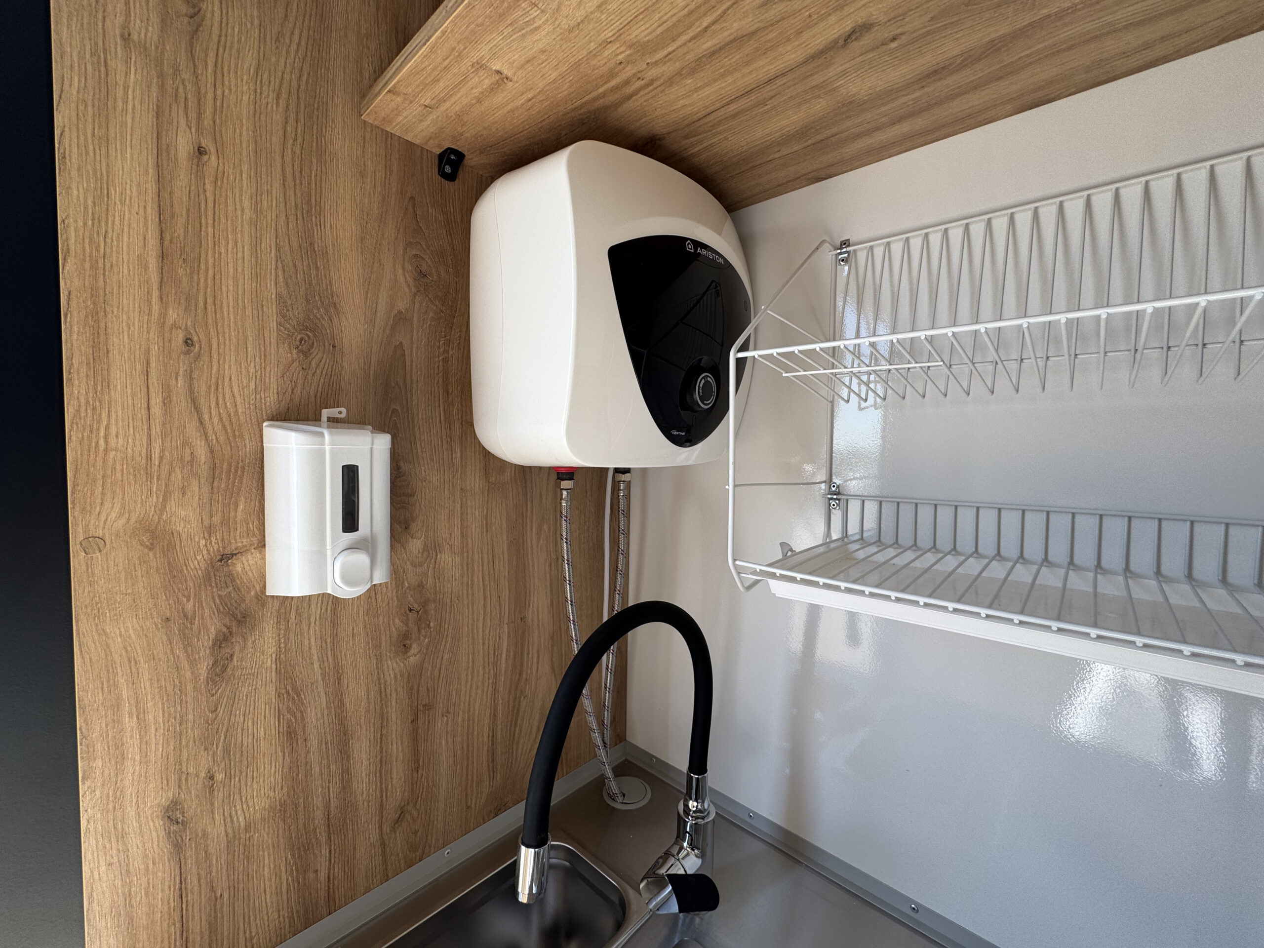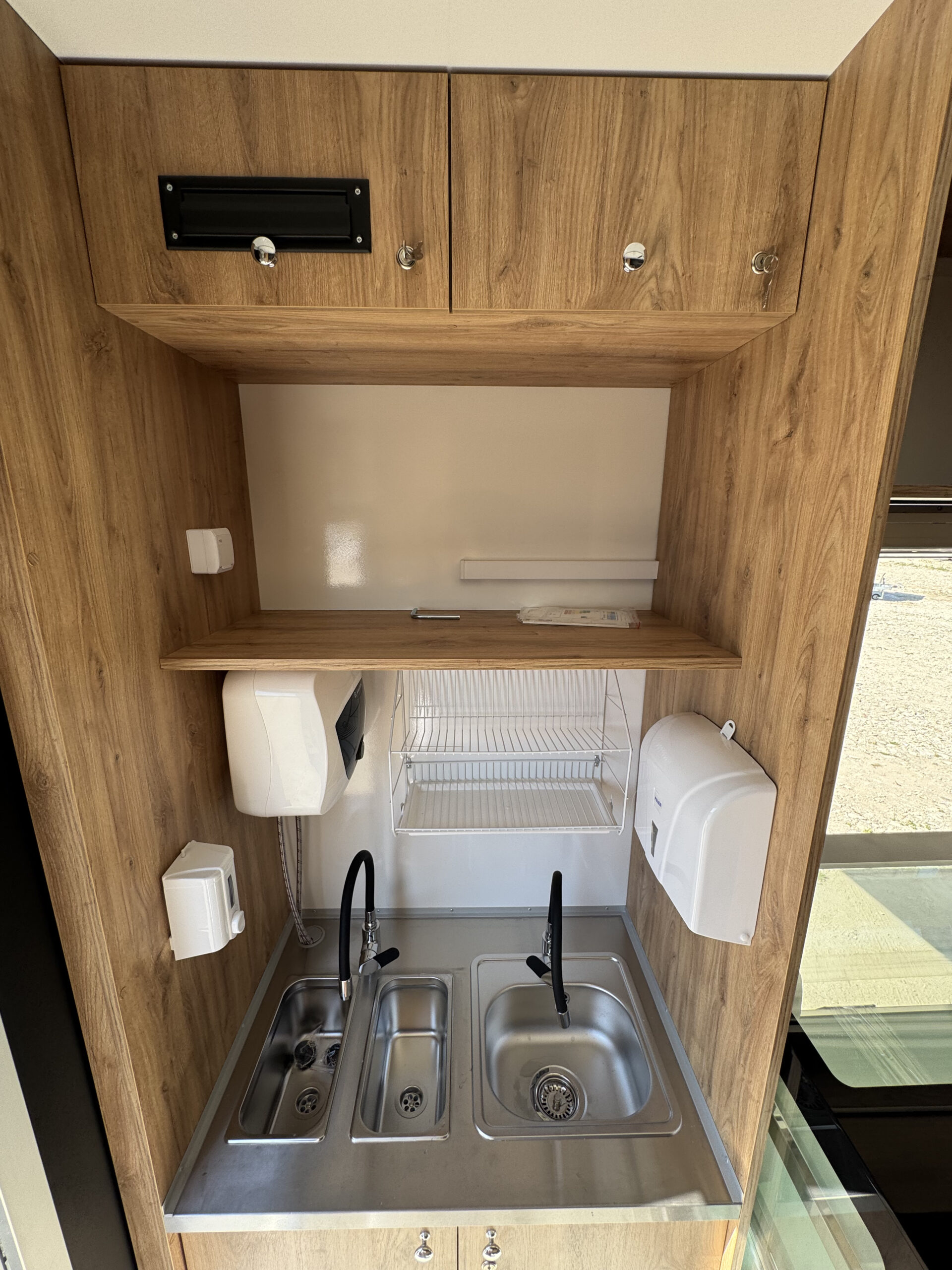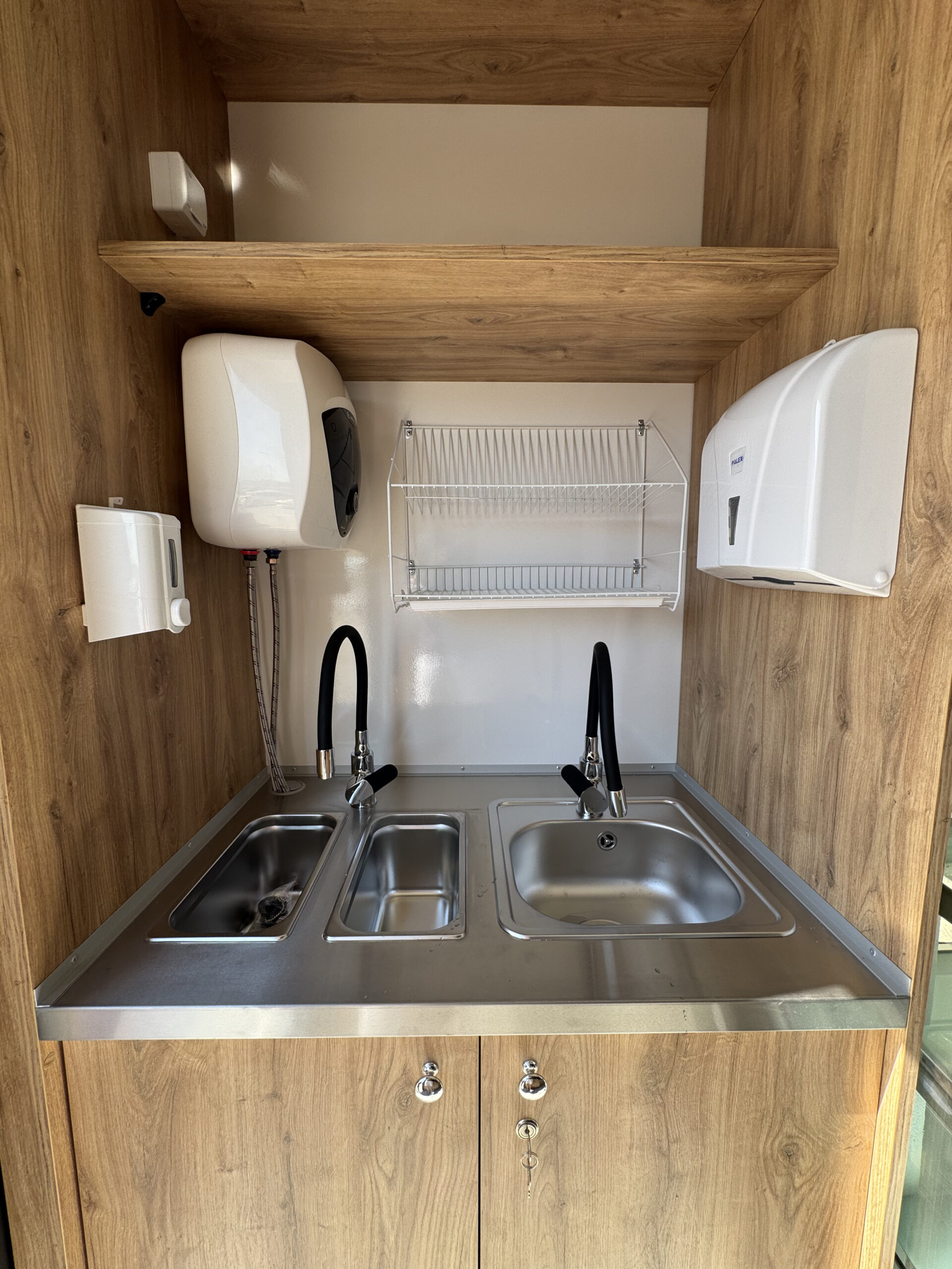 W strefie zaplecza znajduje się podwójny zlew, podgrzewacz wody, pojemniki na ręczniki i środki higieniczne, co umożliwia utrzymanie wysokich standardów czystości. Przyczepa została również wyposażona w wydajne oświetlenie LED, system wentylacji oraz klimatyzację.
